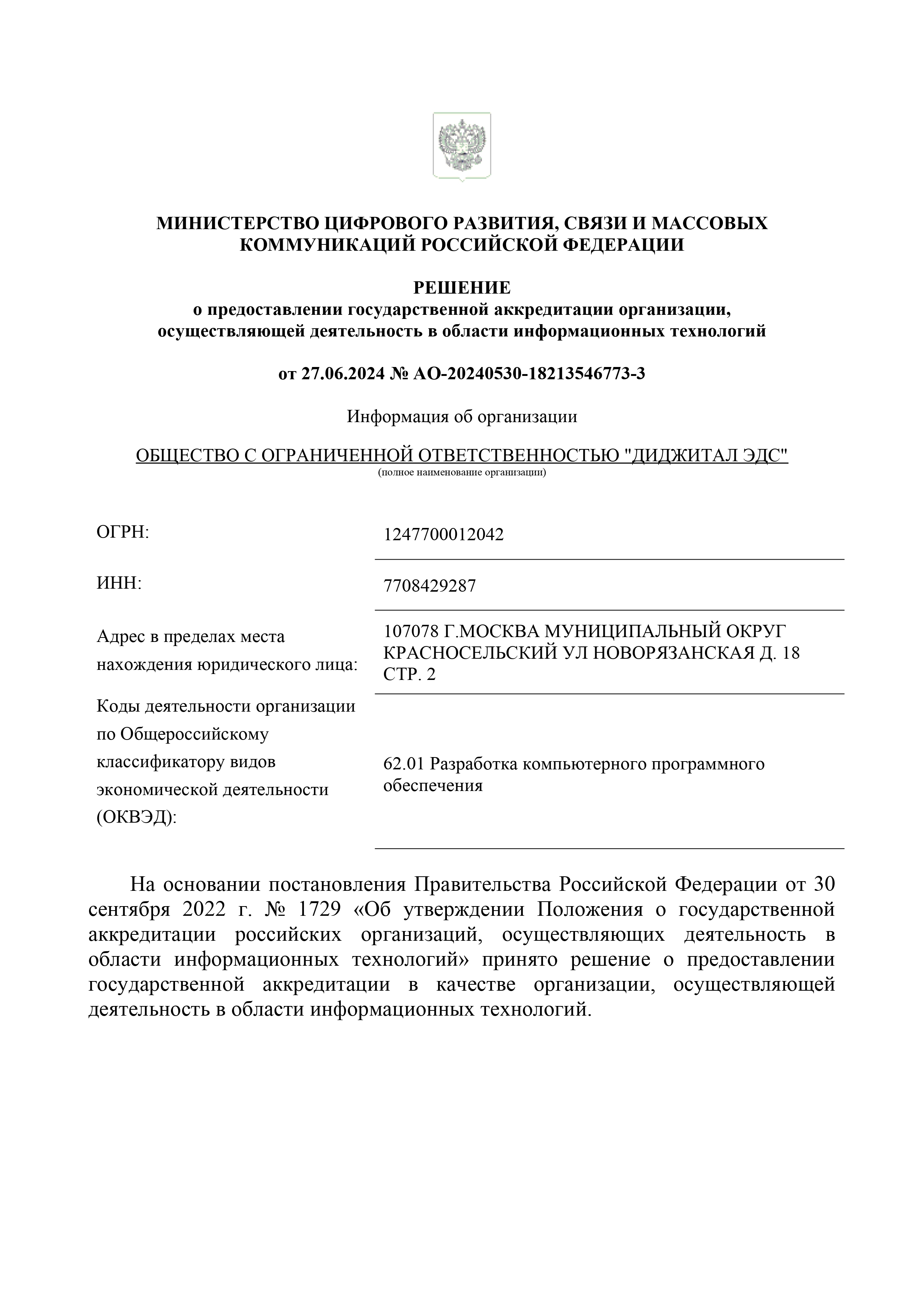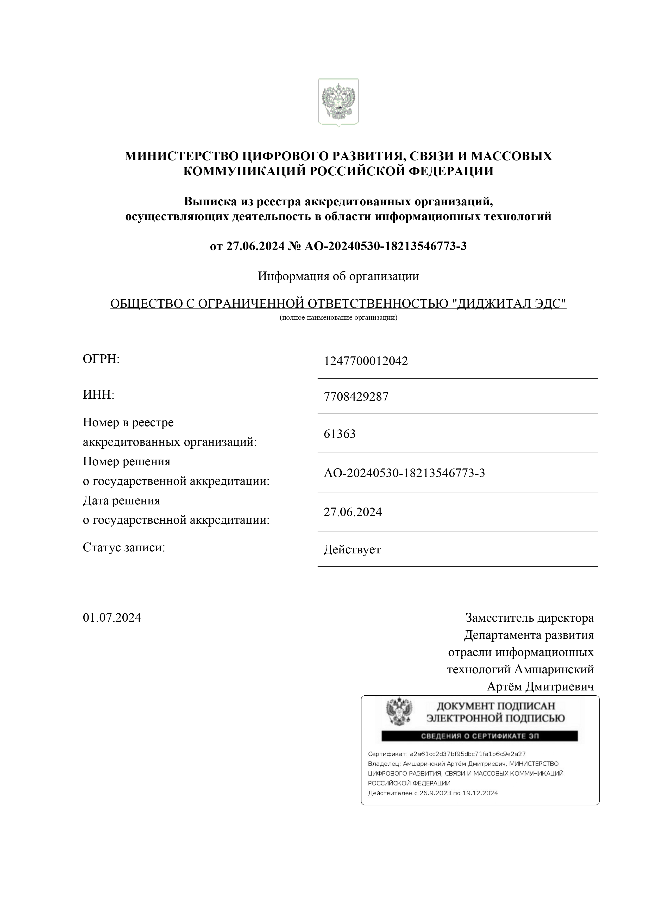 решение о государственной аккредитации от 27.06.2024 № АО-20240530-18213546773-3 , номер в реестре аккредитованных организаций 61363